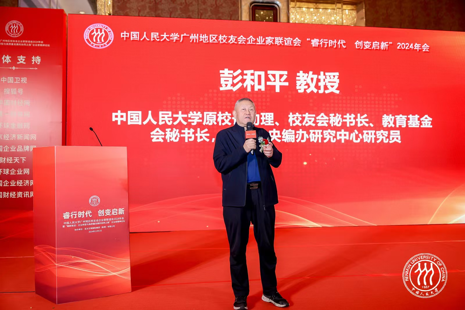 中国人民大学原校长助理、人民大学校友会秘书长、教育基金会、秘书长、中央编办研究中心研究院彭和平教授到会祝贺。对广州地区校友会企业家联谊会在推动区域经济发展的角色予以厚望。